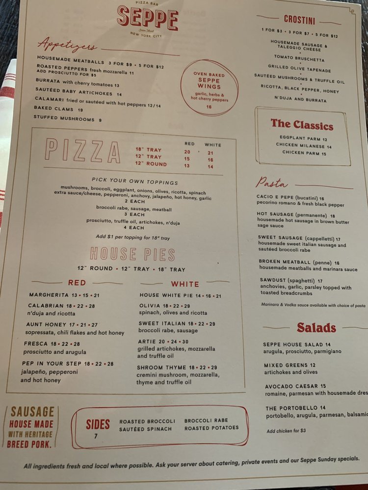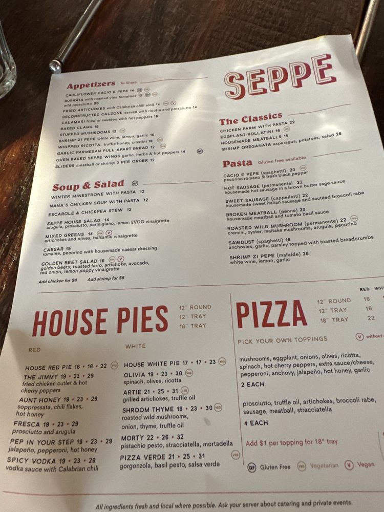 The menu at Seppe Pizza Bar boasts a wide array of delicious dishes, from appetizers like Burrata and Cauliflower Cacio e Pepe to their famous 12 Round Pizzas like The Jimmy and Aunt Honey. Customers rave about the quality of the food and the excellent customer service they receive.