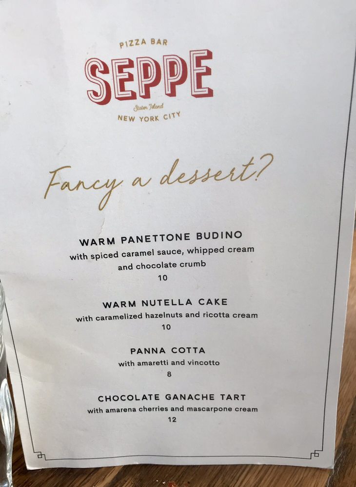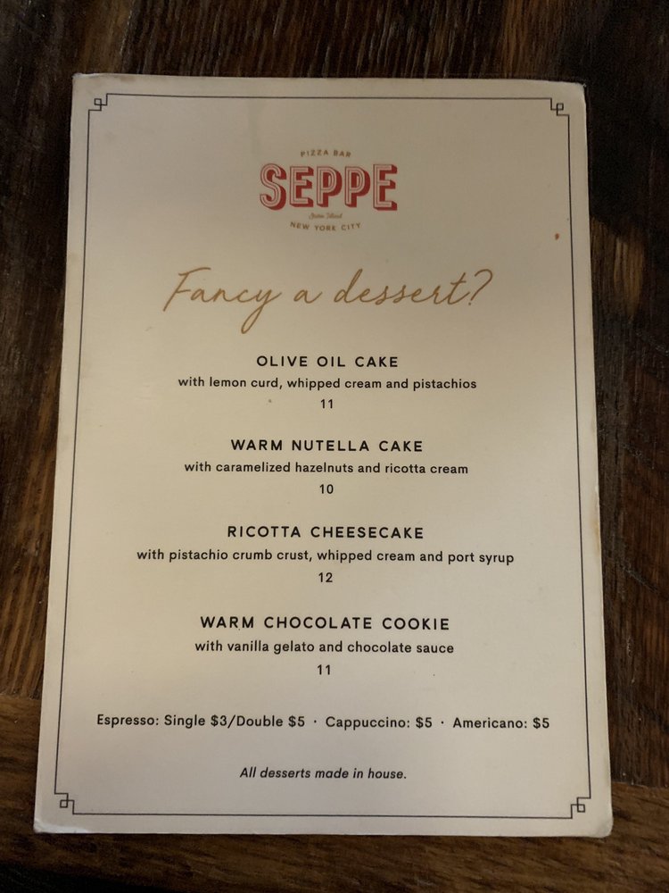 “ If you haven't been to Seppe, you must make the effort to go. Very cozy vibes inside. Staff is friendly & accommodating. We got the Olivia pizza & it was absolutely delicious. Fresh ingredients with a light dough which made for a wonderful meal. ”
