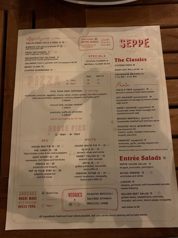 Discover the essence of Italy in the heart of Staten Island at Seppe Pizza Bar! Offering a wide array of mouthwatering dishes, from delectable appetizers like Burrata to irresistible pizza options like The Jimmy, Aunt Honey, and Fresca, this trendy and casual spot is a must-visit. With a full bar, outdoor seating, and friendly staff, Seppe Pizza Bar provides a cozy and inviting atmosphere for customers to enjoy a delightful dining experience. Don't miss out on the opportunity to indulge in delicious food, exceptional service, and a vibrant ambiance at Seppe Pizza Bar.